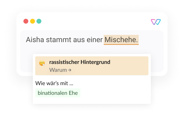 Unsere Welt ist voller Menschen aus allen Gesellschaftsschichten und den verschiedensten Wurzeln. Sie haben unterschiedliche Vorfahren, Traditionen, Lebensweisen und Erstsprachen. Ihre Biografien und ethnischen und kulturellen Identitäten überschreiten nationale Grenzen. Witty weist auf kulturelle und ethnozentrische Klischees hin und auf diskriminierende Sprache im Zusammenhang mit Migration. Wir heben rassistische Sprache sowie auf Wörter und Sätze mit rassistischen Untertönen und Konnotationen hervor. Und du kannst Witty nutzen, um Sprachbarrieren zu beseitigen: Geh sparsam mit Abkürzungen, Akronymen, Füllwörtern und Worthülsen um, die in mehrsprachigen und multikulturellen Umgebungen zu Missverständnissen führen können.